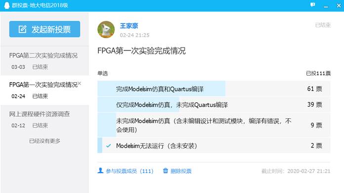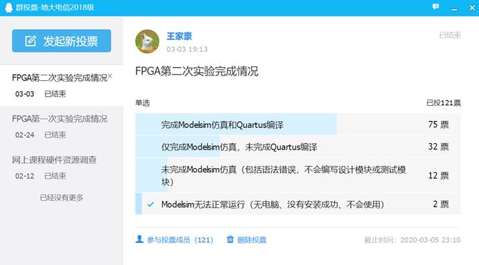 在大部分同学都具备硬件条件并成功安装和破解了Modelsim和Quartus的前提下,王家豪老师根据“数字电路建模、测试模块编写、功能仿真、Quartus编译综合,在FPGA开发板下载码流文件并测试数字电路的功能”这一实验基本流程(除最后一步无法在现有条件下完成),采取分班分时段教学答疑、直播与录播相结合、电脑远程控制解决问题、集中统计实验完成情况等方式进行了实验课程的教学,以达到让学生熟悉和掌握Modelsim和Quartus软件使用方法的实验教学目的。