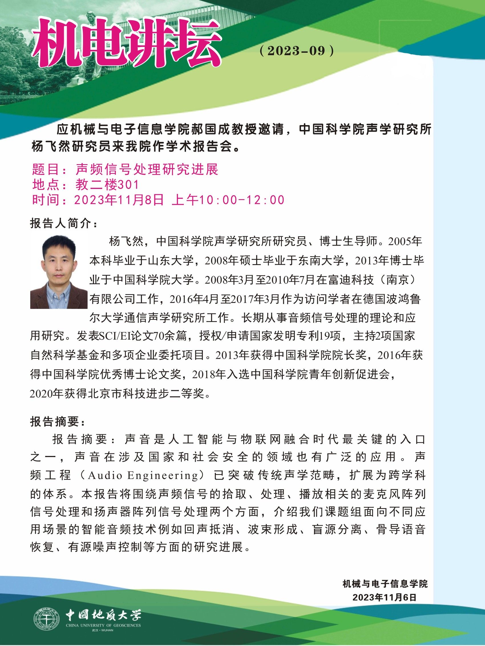 【11月8日】机电讲坛(2023-9):中国科学院声学研究所杨飞然研究员来开云官网作学术报告会