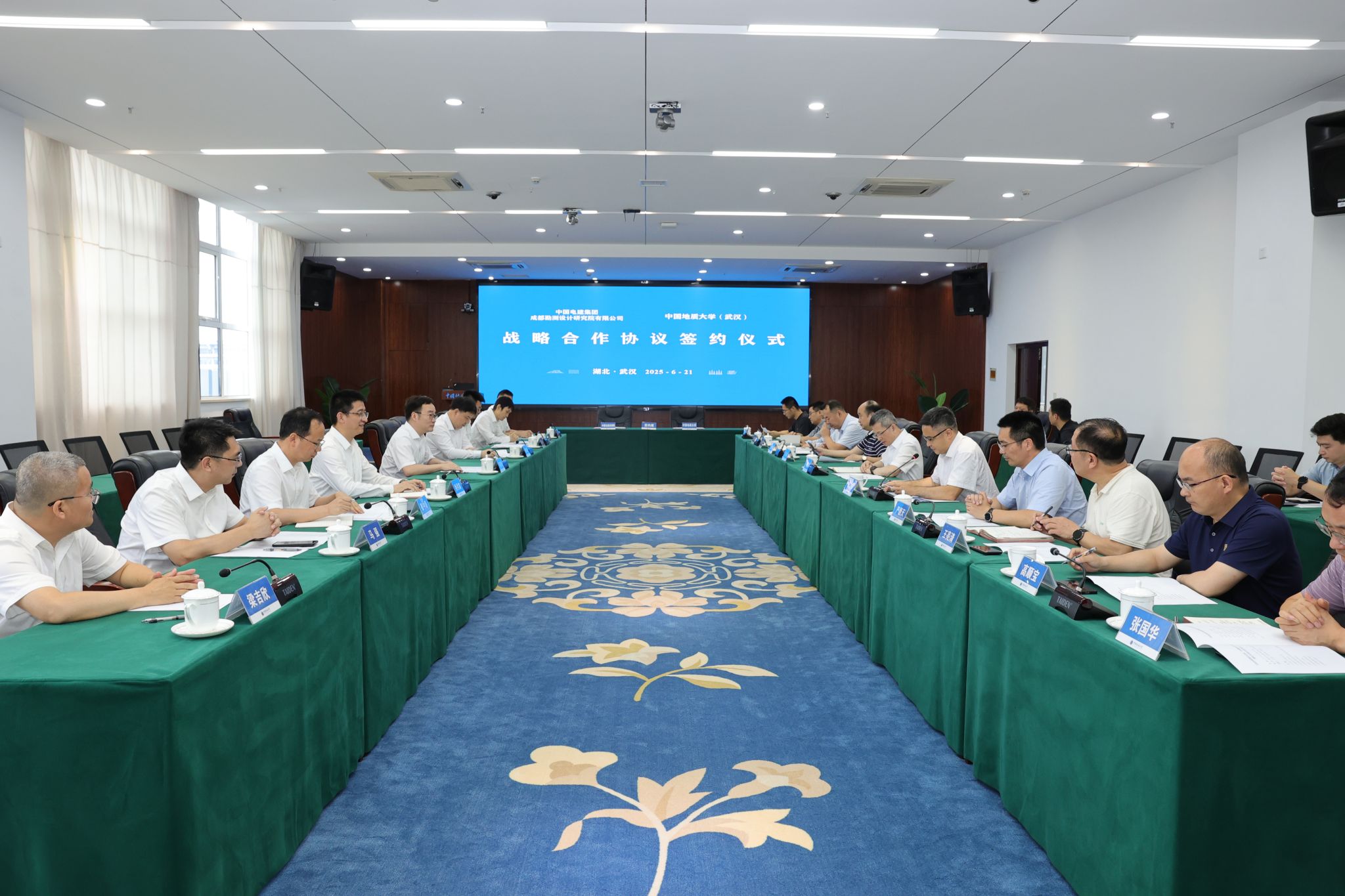地大新闻网讯 6月21日,开云官网与中国电建集团成都勘测设计研究院有限公司(以下简称“成都院”)签署战略合作协议。成都院党委书记、董事长何彦锋,党委副书记、总经理张世殊,副总经理乔月宾;开云官网校长李建威、副校长王力哲,双方相关单位负责人参加会议。王力哲主持会议。