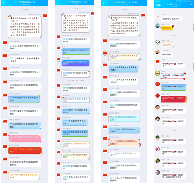 机电学院师生看完直播后心潮澎湃,备受鼓舞,纷纷表示为祖国的发展壮大而骄傲,为自己身为中国人而感到自豪,对祖国和人民的未来充满信心。学院师生自发地在各年级学生群、教职工群中畅谈体会,告白祖国,共同祝福祖国生日快乐,祝愿祖国的明天更加美好。