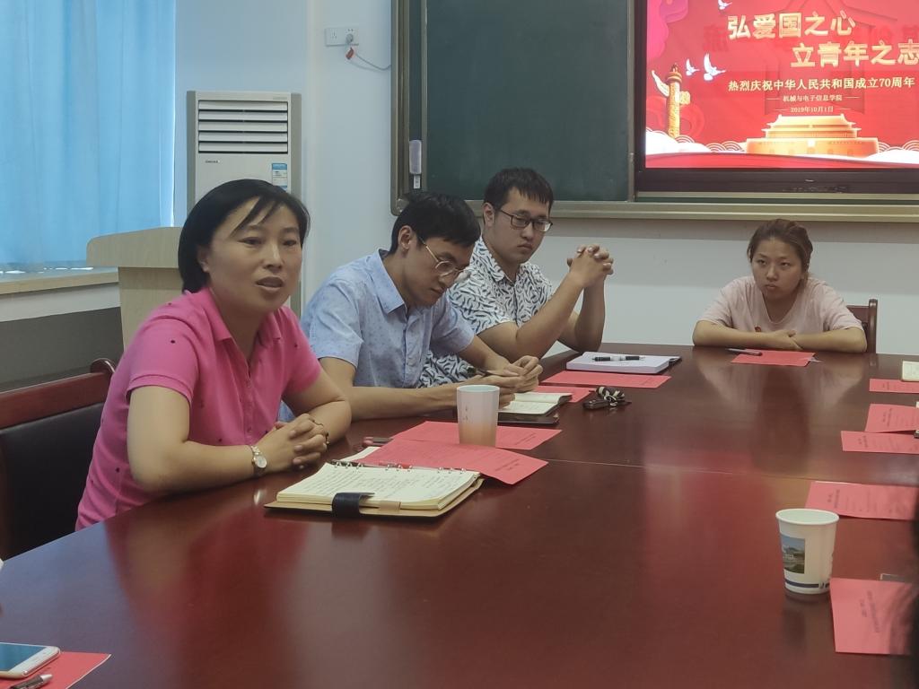 下午3点,机电学院在教二楼502会议室召开庆祝中华人民共和国成立70周年座谈会,学院党委副书记于晓舟、团委书记杜育、辅导员丁钰峰及学院研究生、本科生代表共计20余人参加座谈会。杜育主持座谈会。
