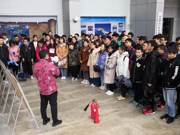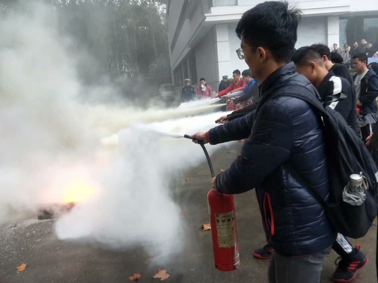 在西区体育馆门口,保卫处张科长首先向大家介绍了学校发生过的校内失火案例,进而告诉大家一些生活中存在的火灾隐患。张科长在介绍了干粉灭火器和二氧化碳灭火器的使用方法并进行实际演示,最后全体学生进行灭火器灭火的实践操作。