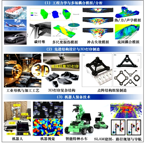 主要围绕智能制造与机器人、航空航天与新能源汽车、深海装备、工业母机等领域,开展(1)优化设计与多物理场耦合模拟(功能一体化设计、拓扑优化、纤维增强复合材料结构;有限元模拟、多尺度模拟、冲击动力学、热力耦合流固耦合;(2)先进制造与3D打印3D打印制造工艺、激光刻蚀界面制备、重型机床研制与加工工艺优化);(3)机器人技术(机器视觉、SLAM建图、路径规划与导航、运动控制、智能驾驶)。